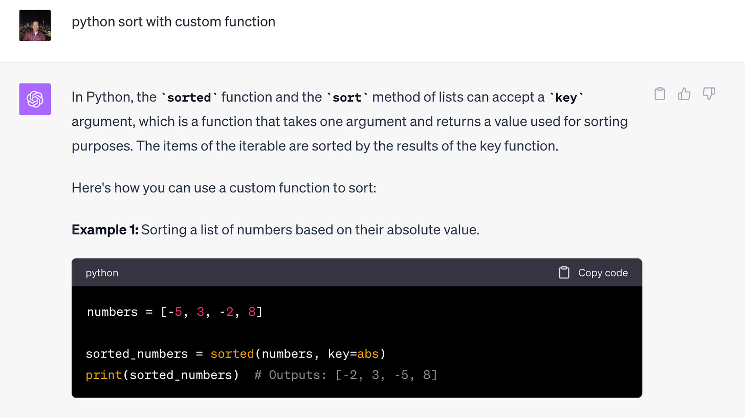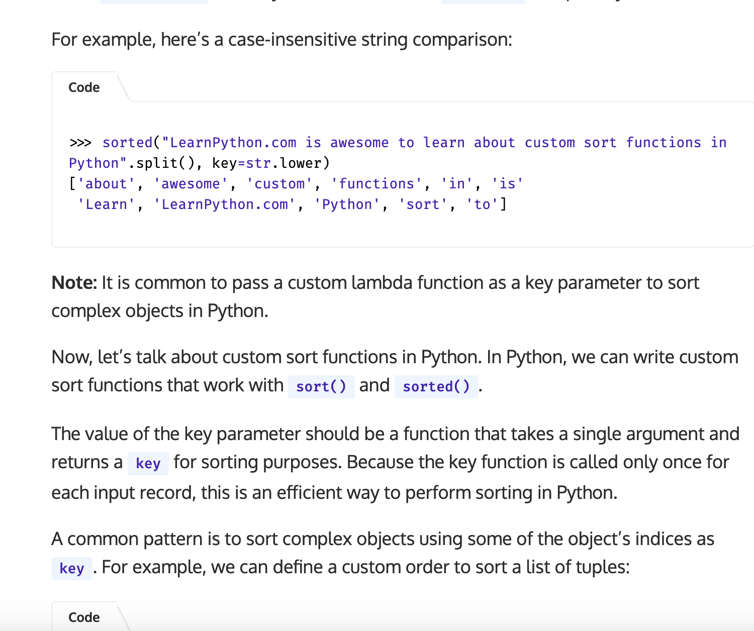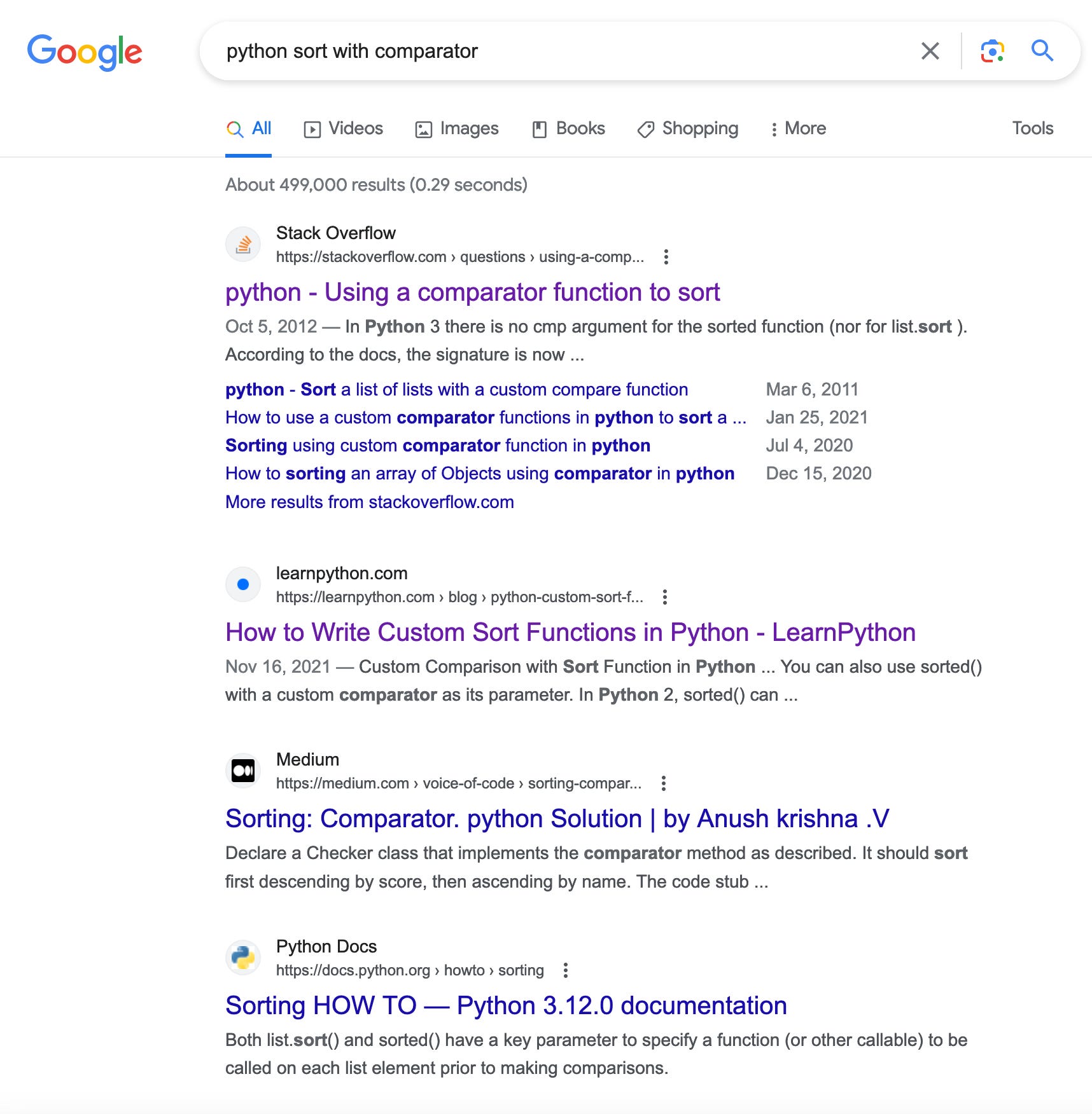I recently needed to look up how to sort a Python list with a custom comparator (specifically, to sort a list according to absolute value). Simple enough query, I know that you can supply a lambda, I just want to see an example to double check that I’m writing valid code. So like most people, I decided to open up Google: