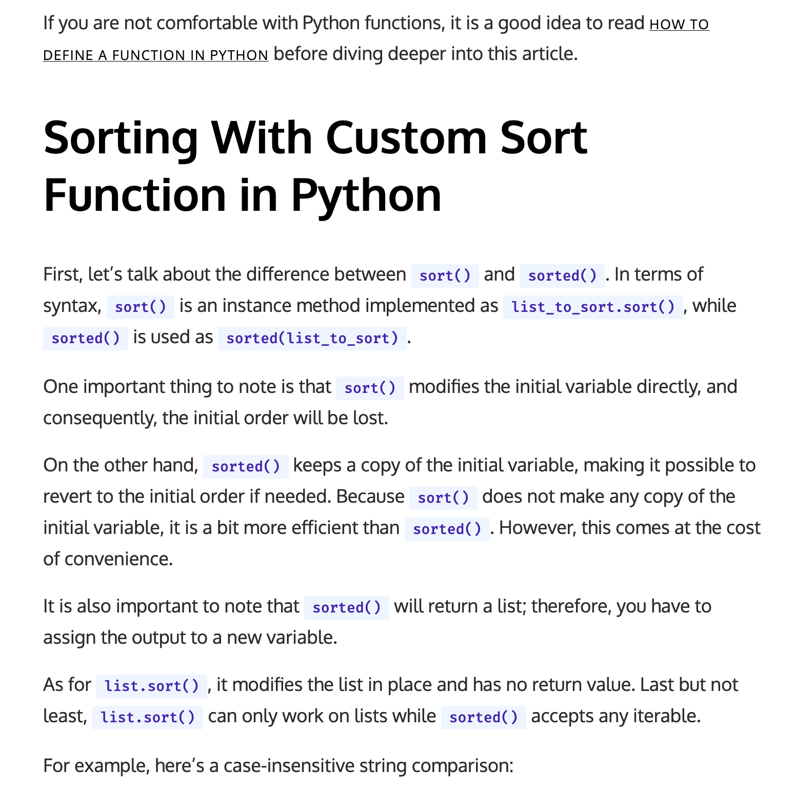To get to this piece of information, I had to scroll through 4 screen-lengths of boilerplate SEO spam and un-useful content. If someone is asking for a custom comparator, why do they need to know the difference between sort and sorted?