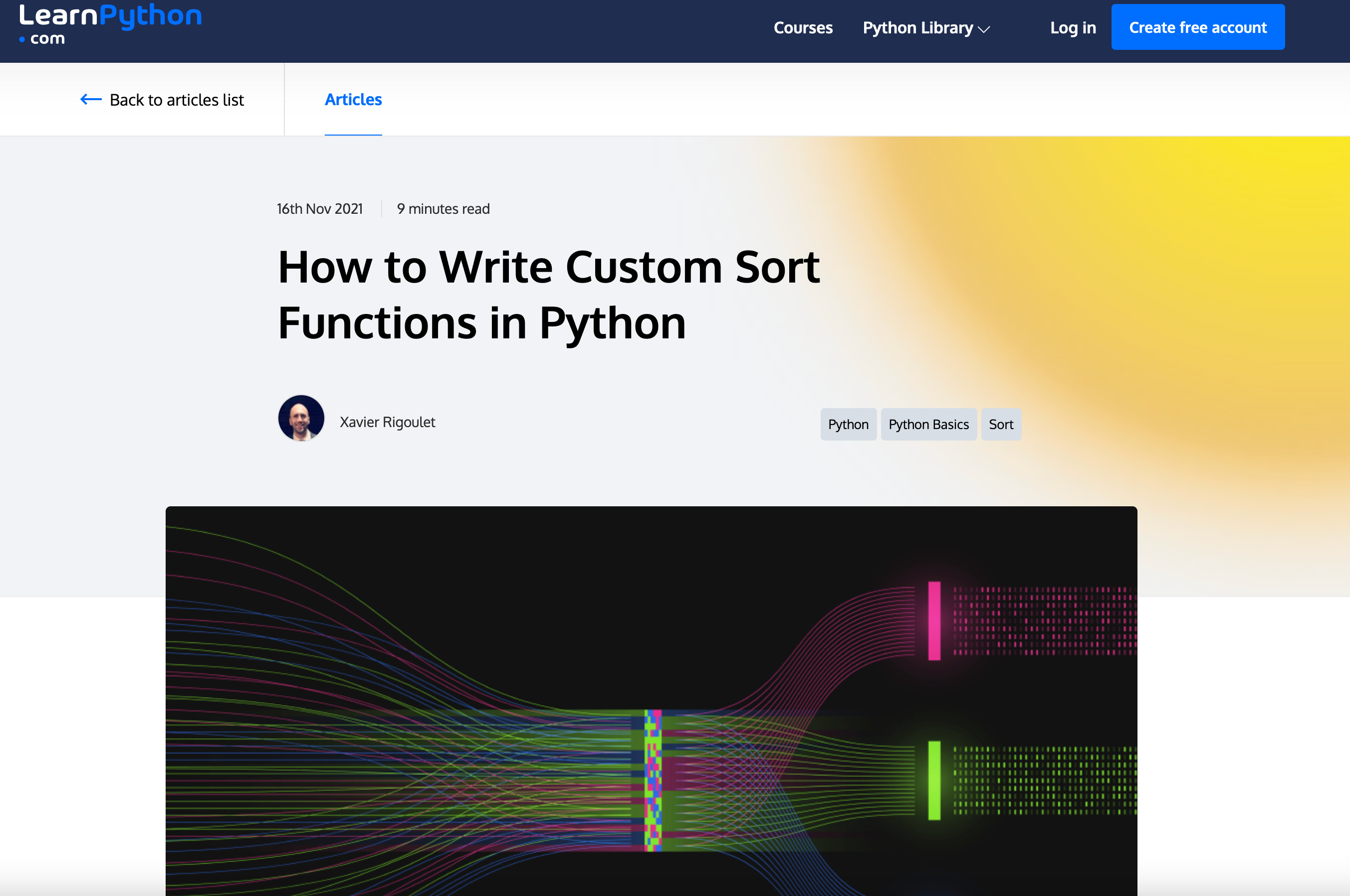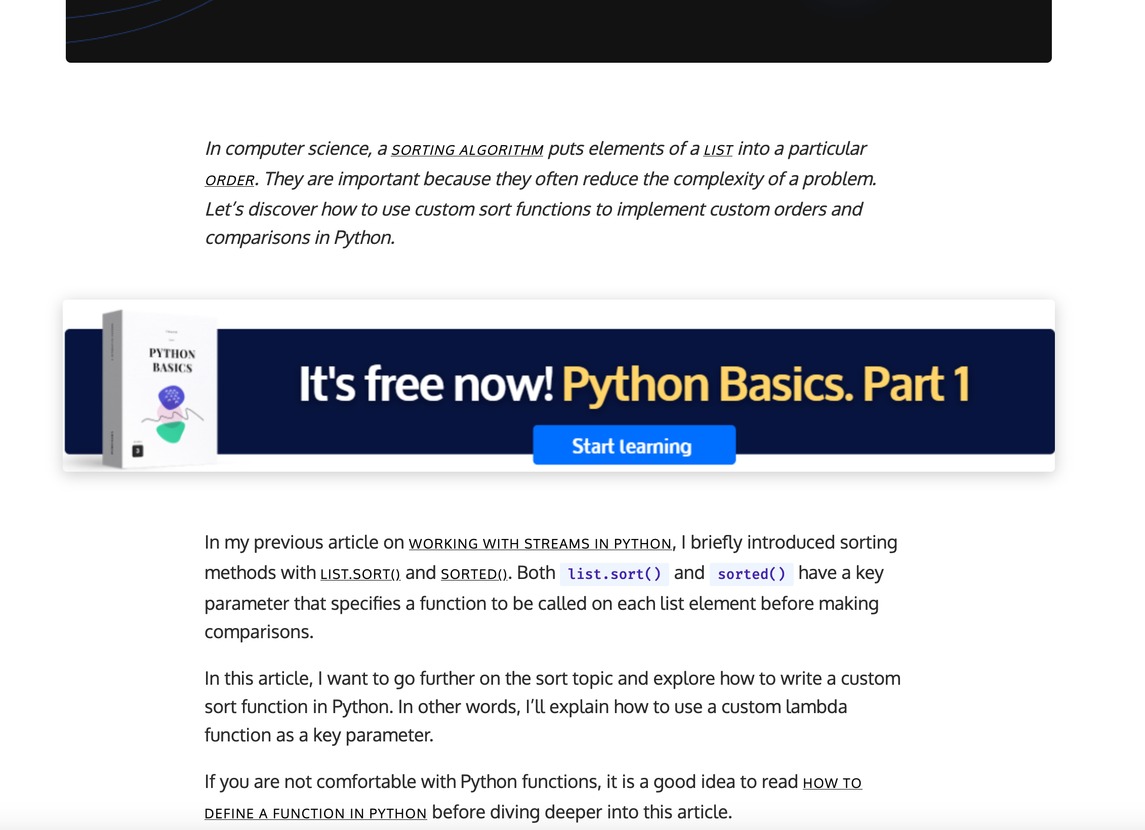 Scrolling down, I see an intro into what sorting is, and then an ad for a basic python course.